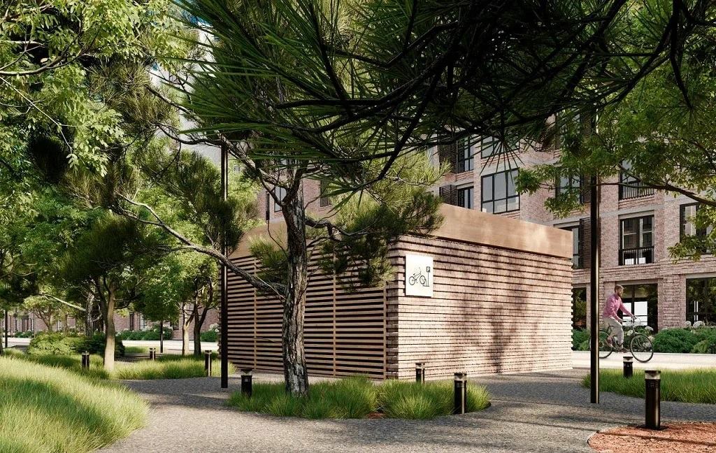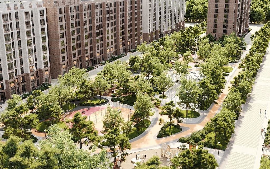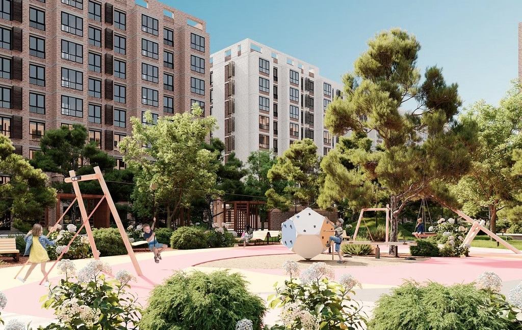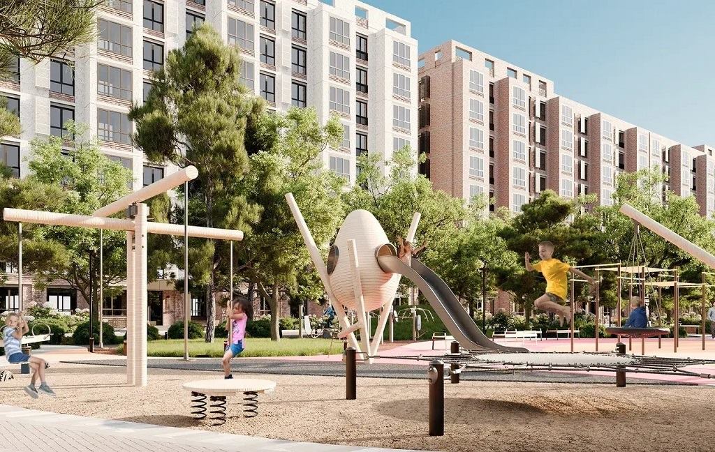 | Концепция «двор без машин» реализована полностью: гостевые парковки вынесены за периметр, а внутри — только пешеходные зоны, детские площадки с безопасным резиновым покрытием, зоны для воркаута и скамейки в тени деревьев. |