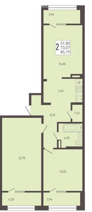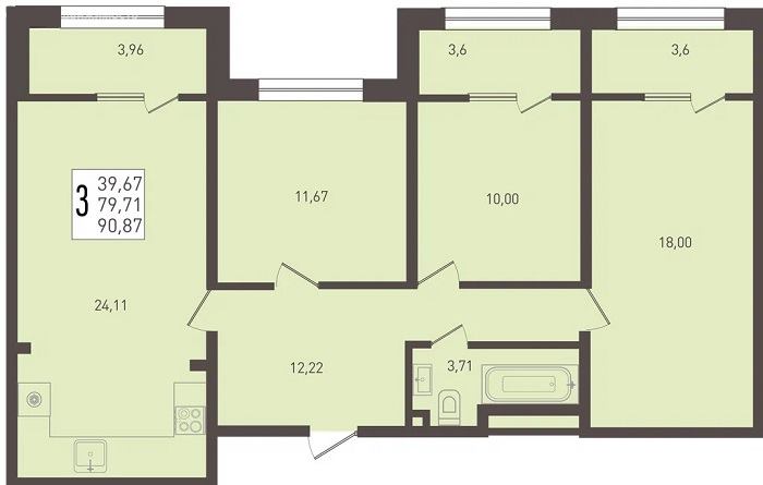 3-комнатная 78–87 Удобная планировка для семьи с детьми, возможность выделить кабинет. |
