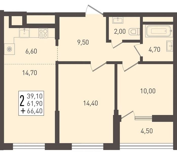2-комнатная 55–65 Две изолированные комнаты, гардеробная зона в прихожей.