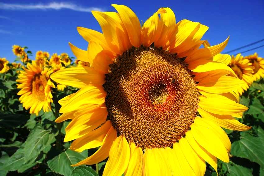 | В дальнейшем технология выращивания подсолнуха предполагает послевсходовое боронование с внесением гербицидов для защиты слабеньких всходов от сорных трав. В начальный период вегетации подсолнечника важно проводить междурядные прополки, а перед цветением вывезти на поле пасеку с пчелами для повышения урожайности подсолнухов. На протяжении всего вегетационного периода необходимо следить, не появилось ли на подсолнечнике вредителей и симптомов болезней, и своевременно проводить обработку инсектицидами. Уборку проводят после того, как большинство корзинок подсолнуха приобретут бурый цвет, а влажность семян будет от 12% до 20%. |
