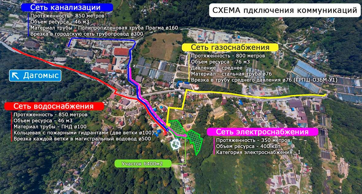 | Все коммуникационные сети оплачены, оформлены, построены и имеют следующие технические характеристики: наружные сети газоснабжения (мощность 76 м3, протяженность 800 м); наружные сети водоснабжения и канализации (мощность 46 м3, протяженность 850 м); наружные сети электроснабжения (мощность 400 кВт, протяженность 350 м). |