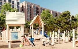 | Концепция «двор без машин» реализована полностью: гостевые парковки вынесены за периметр, а внутри — только пешеходные зоны, детские площадки с безопасным резиновым покрытием, зоны для воркаута и скамейки в тени деревьев. |