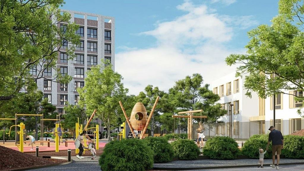 | Концепция «двор без машин» реализована полностью: гостевые парковки вынесены за периметр, а внутри — только пешеходные зоны, детские площадки с безопасным резиновым покрытием, зоны для воркаута и скамейки в тени деревьев. |