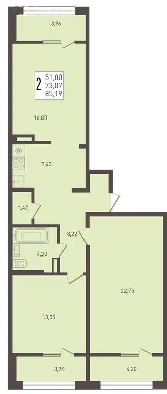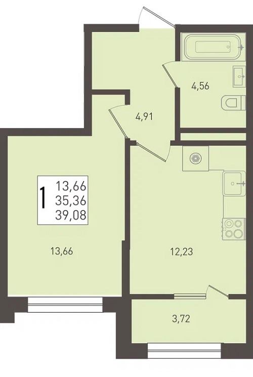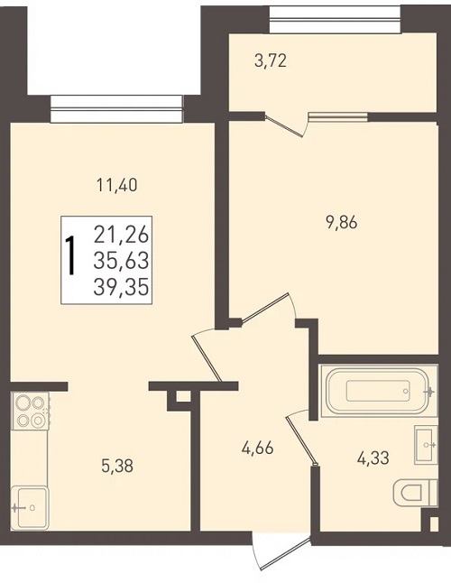 1-комнатная 38–42 Кухня-гостиная, раздельный санузел (в большинстве вариантов).