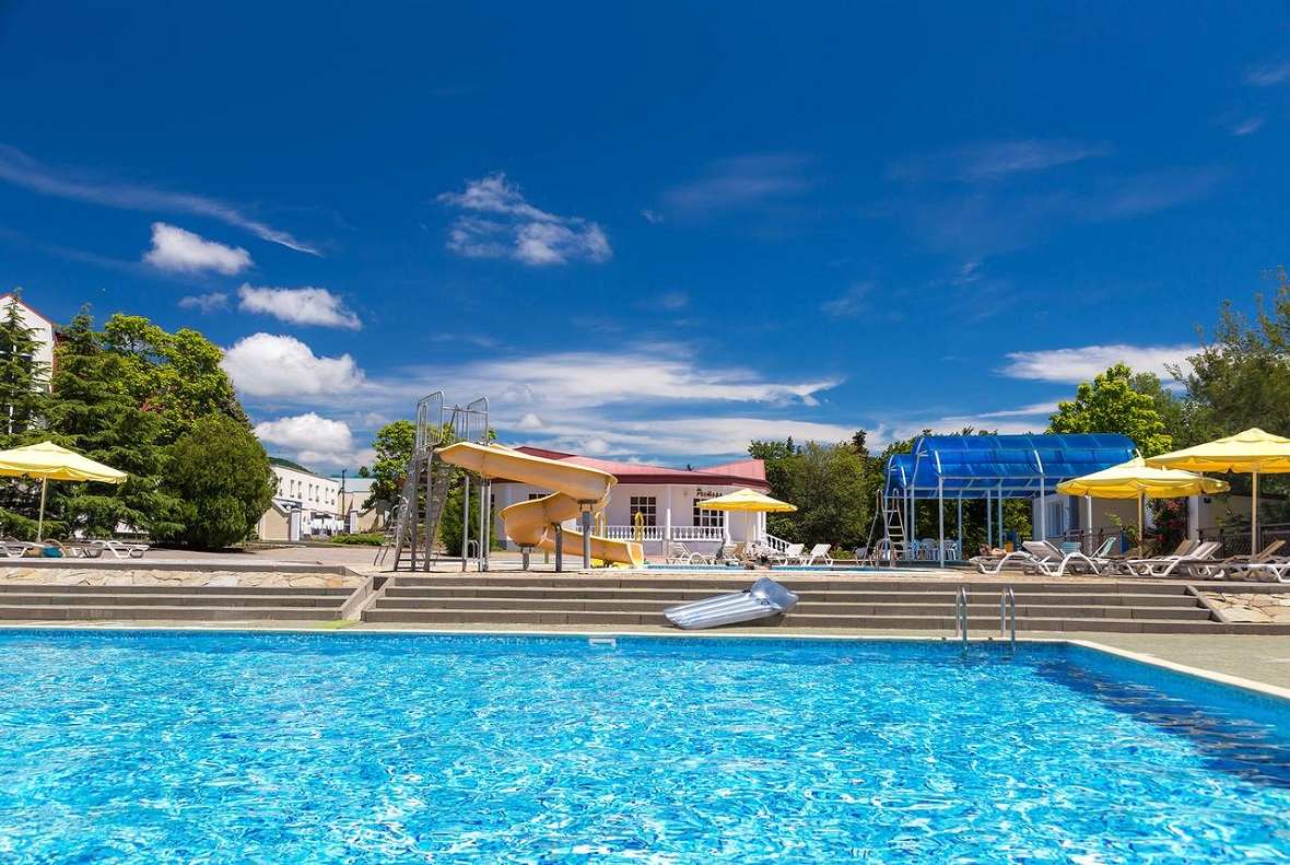 | На территории расположен мини аквапарк из трех бассейнов. Площадь бассейна для взрослых – 162 м2 (18 м х 9 м), детские бассейны совмещены – 107 м2 (12м х 6 м и 4м х 8м); подогрев во всех чашах. При аквапарке имеется бар с напитками. |